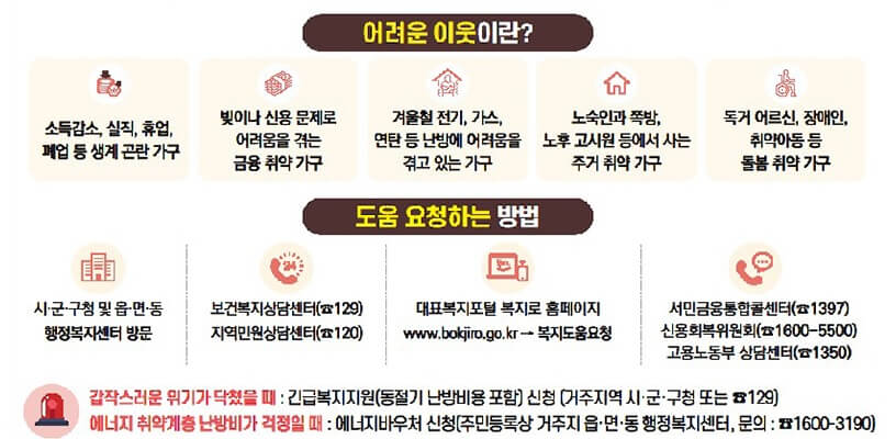 - 이번 겨울에는 신규로 확보한 위기정보를 토대로 겨울철에 어려움이 큰 생활요금 체납 가구와 독거어르신, 장애인 등 취약가구 약 8만 명을 집중 점검합니다.
